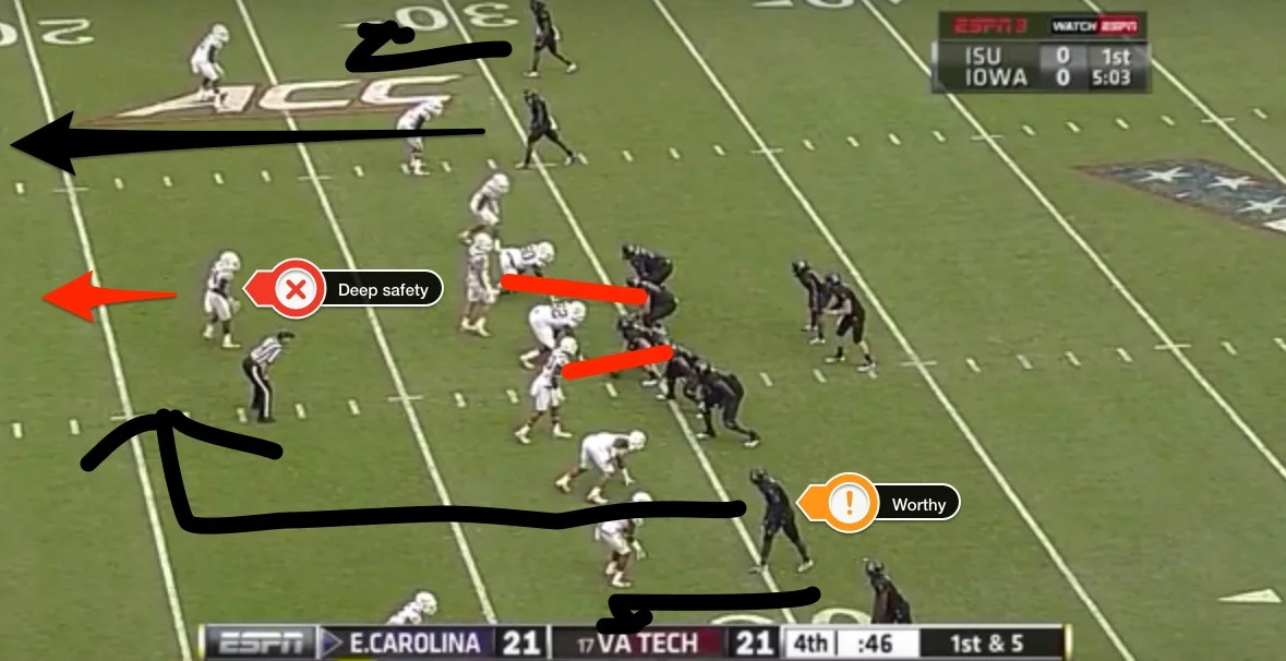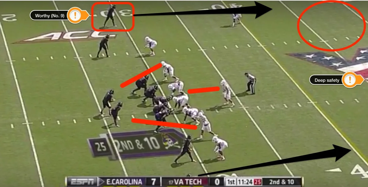 In the sequence above, Riley has ECU lined up in 10 personnel with a 2x2 set (two split receivers on both the right and left sides of the field). Tech plays Cover 1 and brings five rushers at the snap, with a sixth coming on a delayed blitz from the middle linebacker position. The Hokie corners are pressing the Pirate receivers, except for Brandon Facyson (No. 31), who’s giving Worthy (No. 9) a 10-yard cushion at the top of the screen.