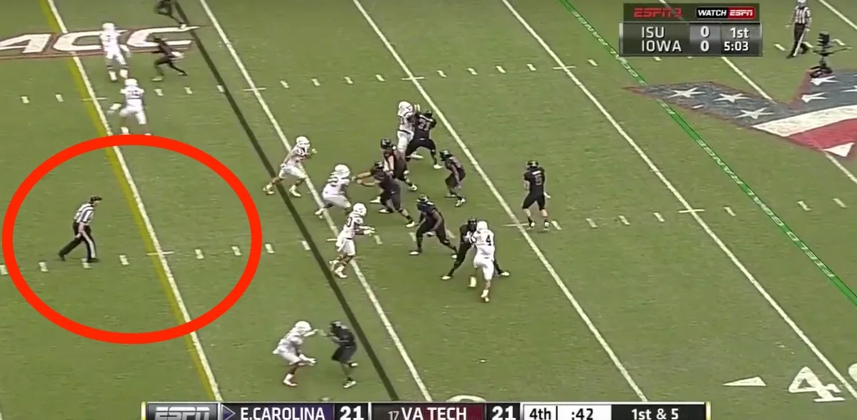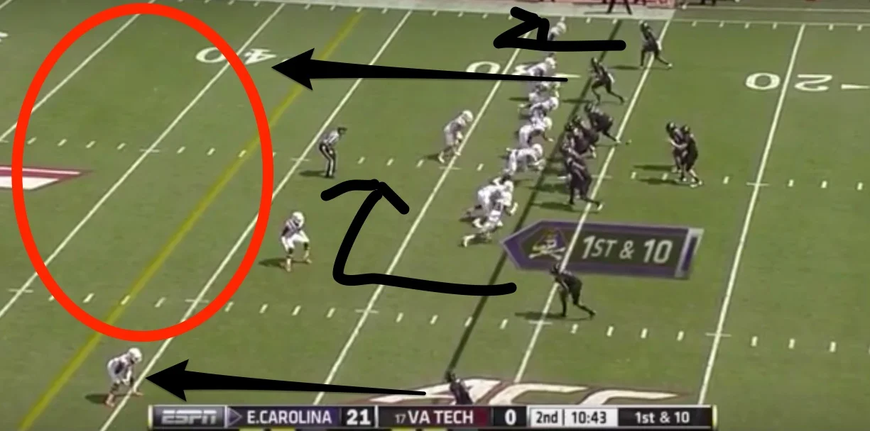 The Pirates were flat gunning, throwing on about 70 percent of downs. The ECU offensive line’s aforementioned inability to block Tech essentially turned the Pirates' running game into a change-of-pace option to keep the Hokies off-guard.