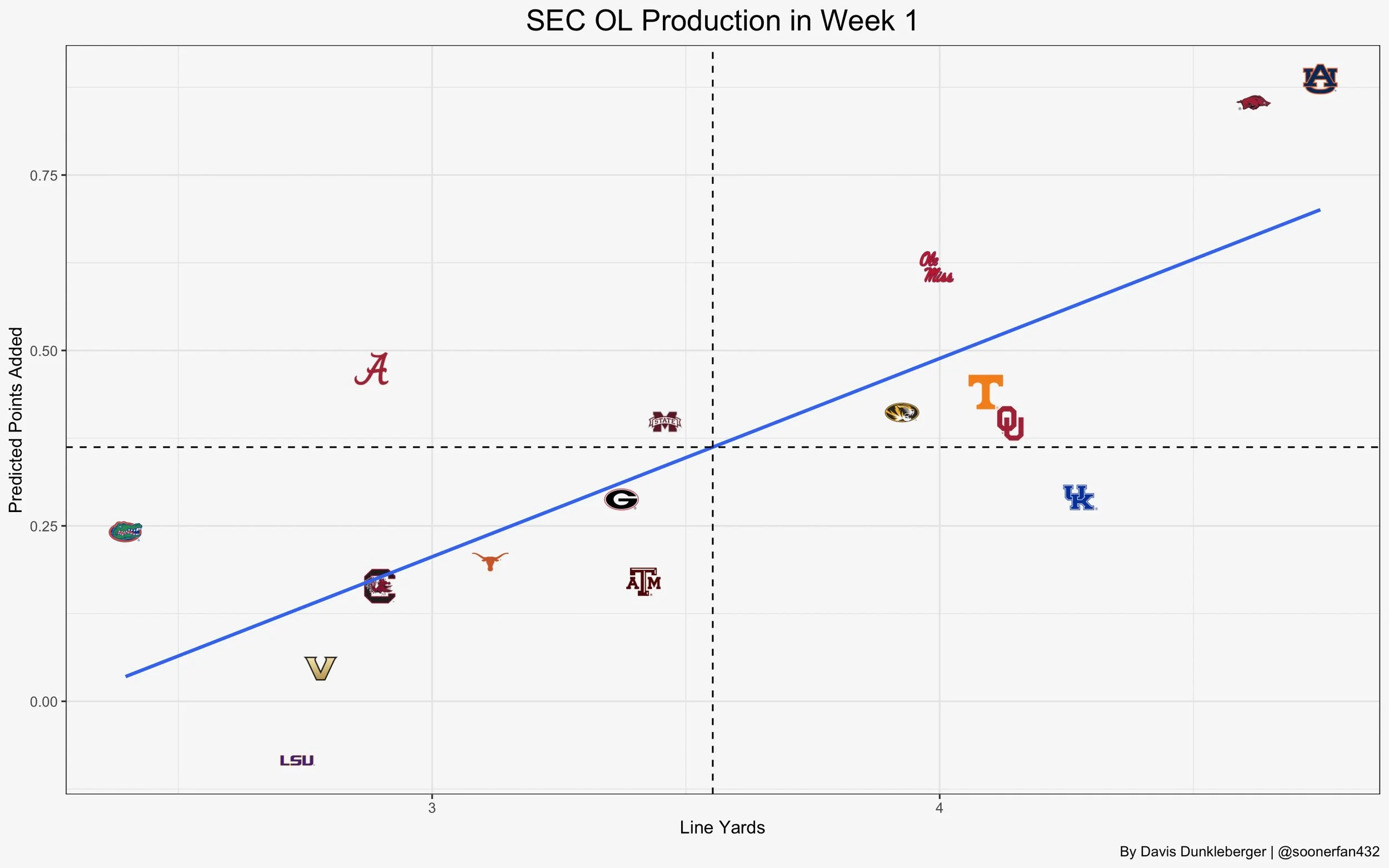 Davis created the above graph plotting the SEC teams and their OL performances across week one. PPA or Predicted Points Added is an attempt to measure the success of each run and assign a value to the overall performance by equating the success to points scored.