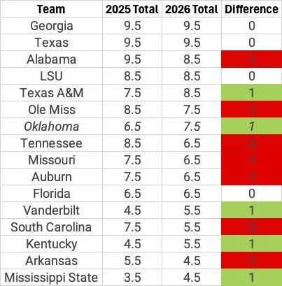 For starters, relative to this time in 2025, it appears as though oddsmakers expect backsliding in the win-loss column this year across the SEC. Of the 16 teams in the conference, FanDuel has set the anchor at least a full game lower for seven of them this season. Note that OU is one of just five squads with a higher preseason win total this year.